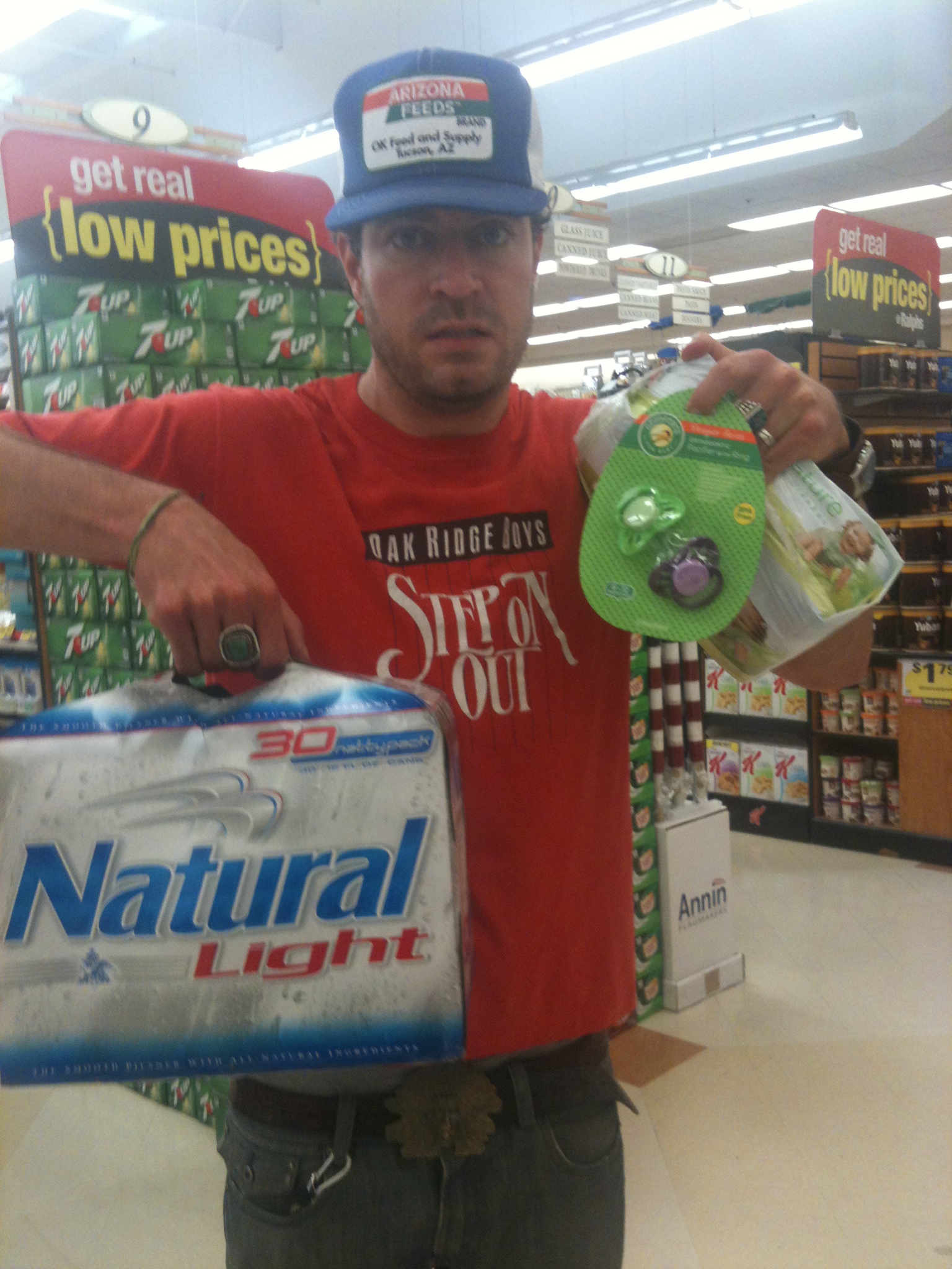 A typical trip to the store for the author. Pacifiers, Organic diapers. And a 30 pack of Natty Light.